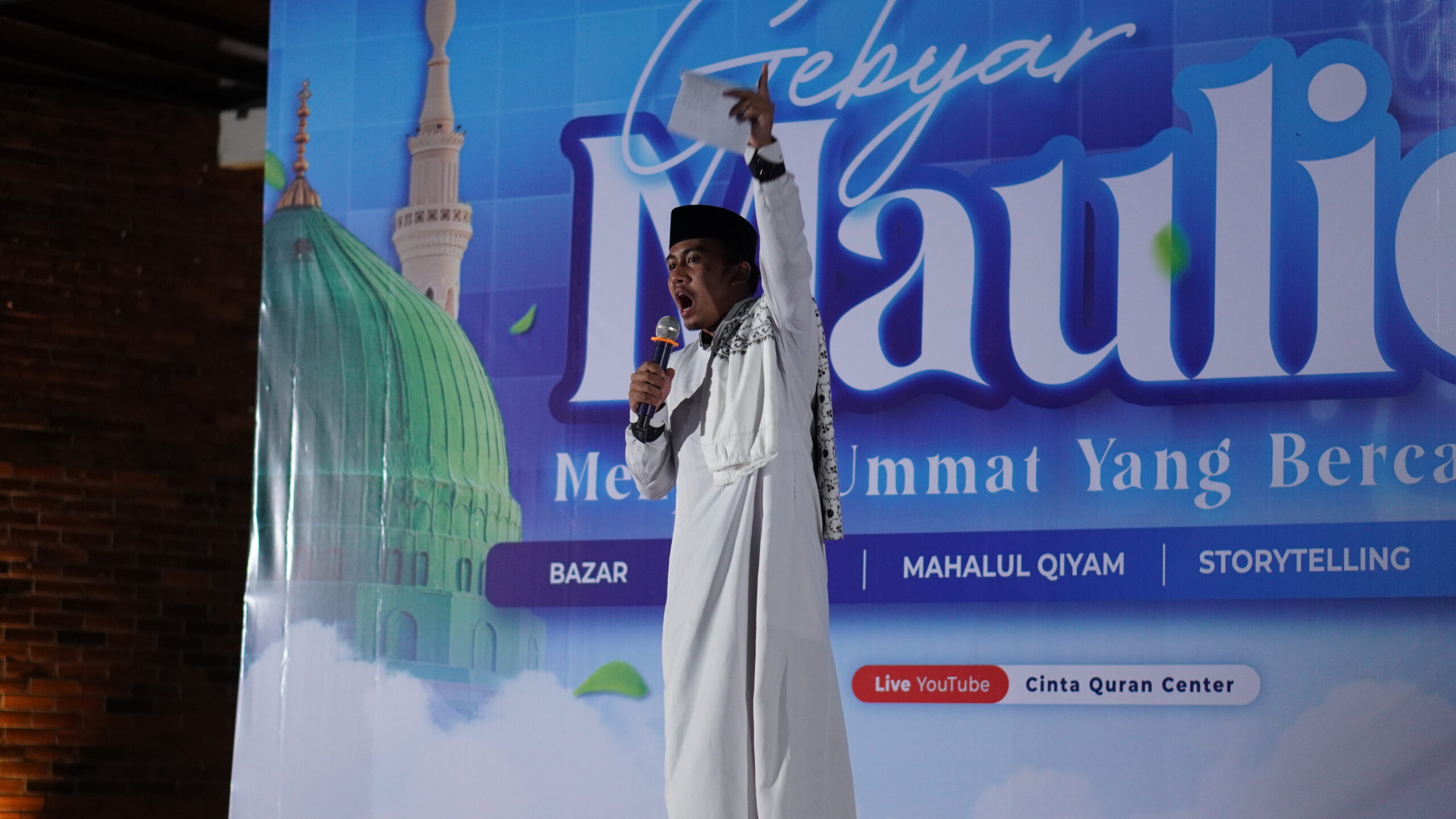 Sabtu malam (13/9) kemarin, Plaza Cinta Quran Center (CQC) dipenuhi ratusan jamaah. Santri, masyarakat sekitar CQC, hingga tamu undangan hadir untuk bersama-sama menghidupkan suasana Gebyar Maulid, event yang digelar untuk memperingati kelahiran junjungan umat Islam, Nabi Muhammad ﷺ. Acara ini diprakarsai oleh Badan Eksekutif Mahasantri (BEM) CQC dan berlangsung sejak bakda maghrib hingga pukul 22.30 WIB.
