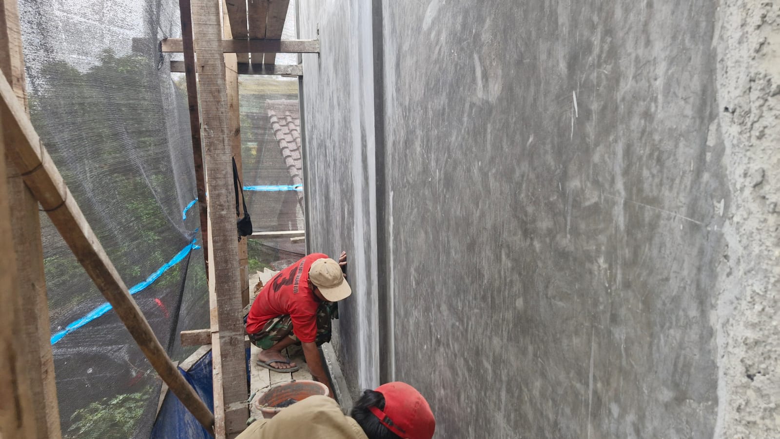 - Acian Dinding Eksterior: proses penghalusan permukaan dinding luar bangunan telah dilakukan. Tahap ini penting untuk memperkuat lapisan plester sekaligus mempersiapkan bangunan menuju tahap finishing agar lebih rapi dan tahan terhadap cuaca.