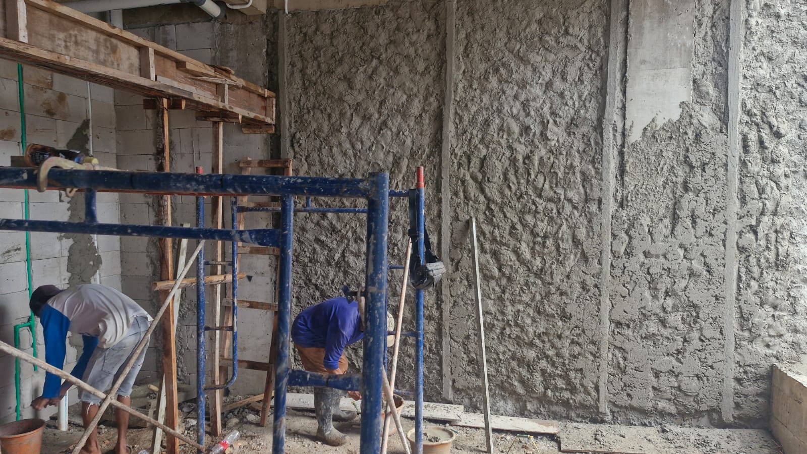 - Plesteran Dinding Lantai 1: pengerjaan plester pada lantai 1 terus berjalan. Tahapan ini merupakan proses penting untuk memperkuat struktur dinding sebelum masuk ke tahap akhir seperti pengecatan dan instalasi pendukung lainnya.