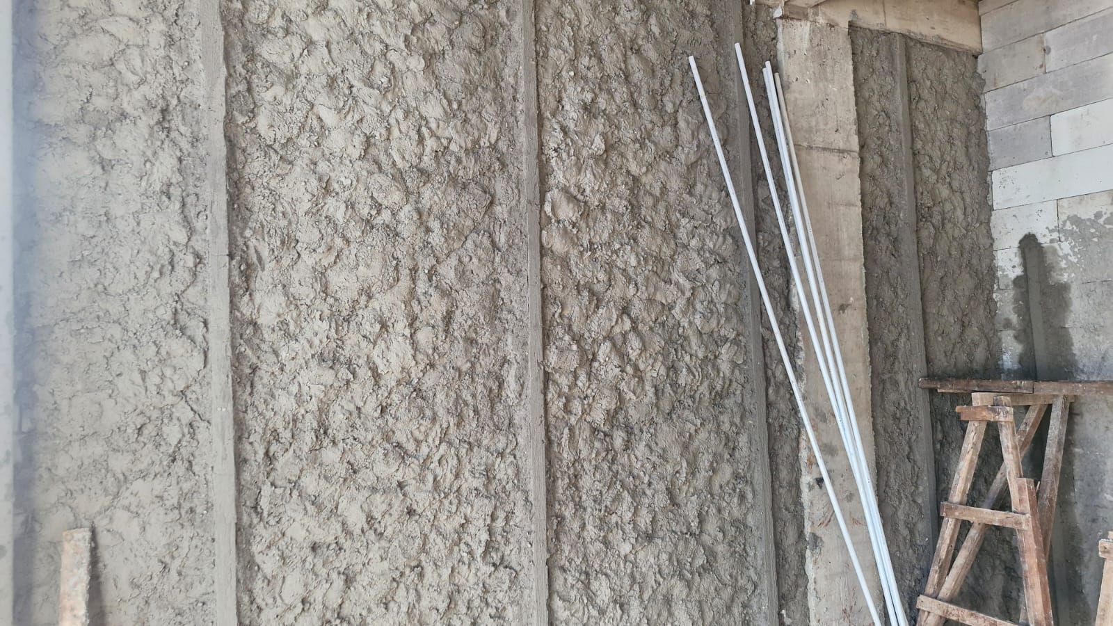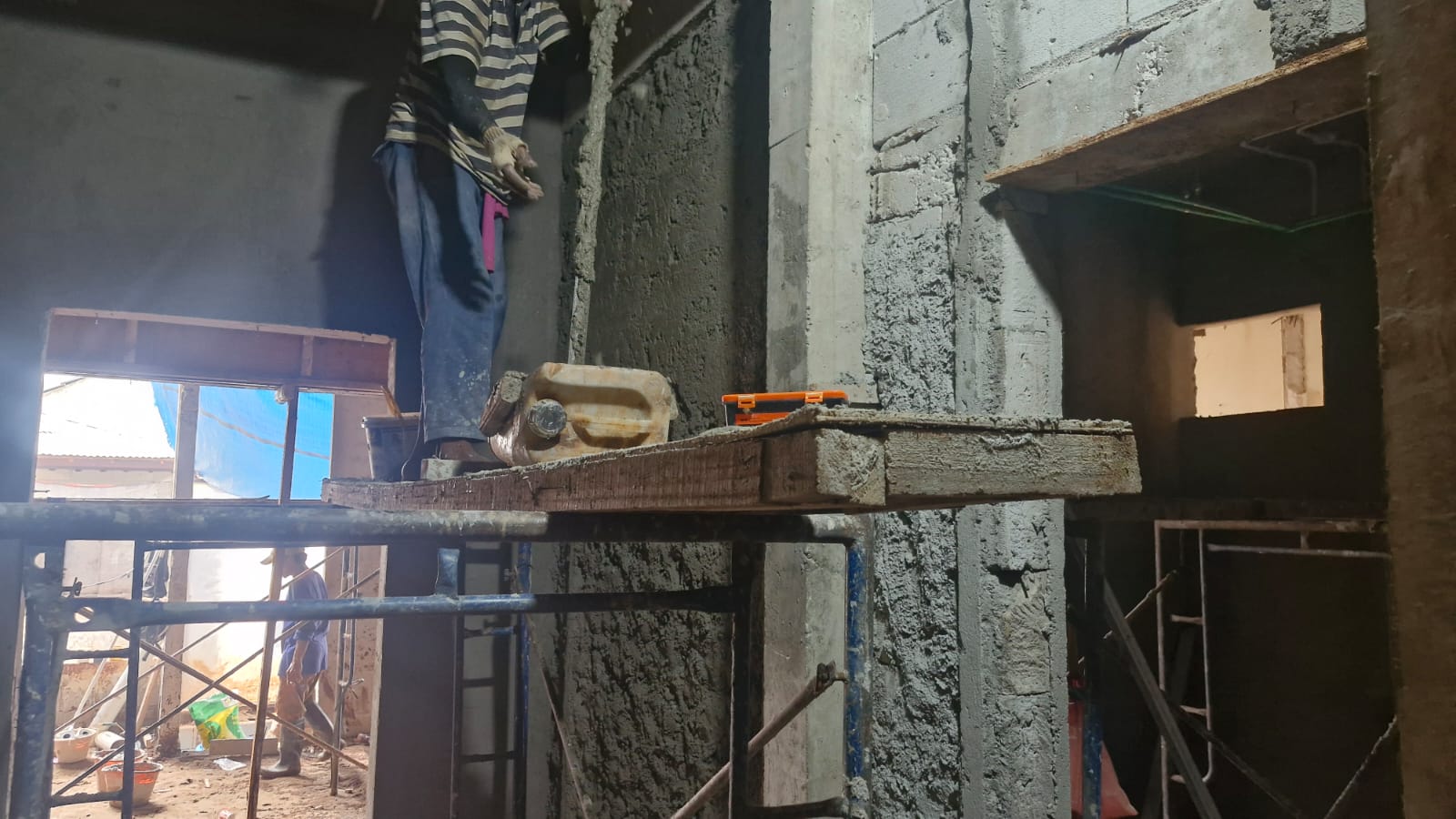 - Plesteran Dinding Lantai 1: pengerjaan plester pada lantai 1 terus berjalan. Tahapan ini merupakan proses penting untuk memperkuat struktur dinding sebelum masuk ke tahap akhir seperti pengecatan dan instalasi pendukung lainnya.
